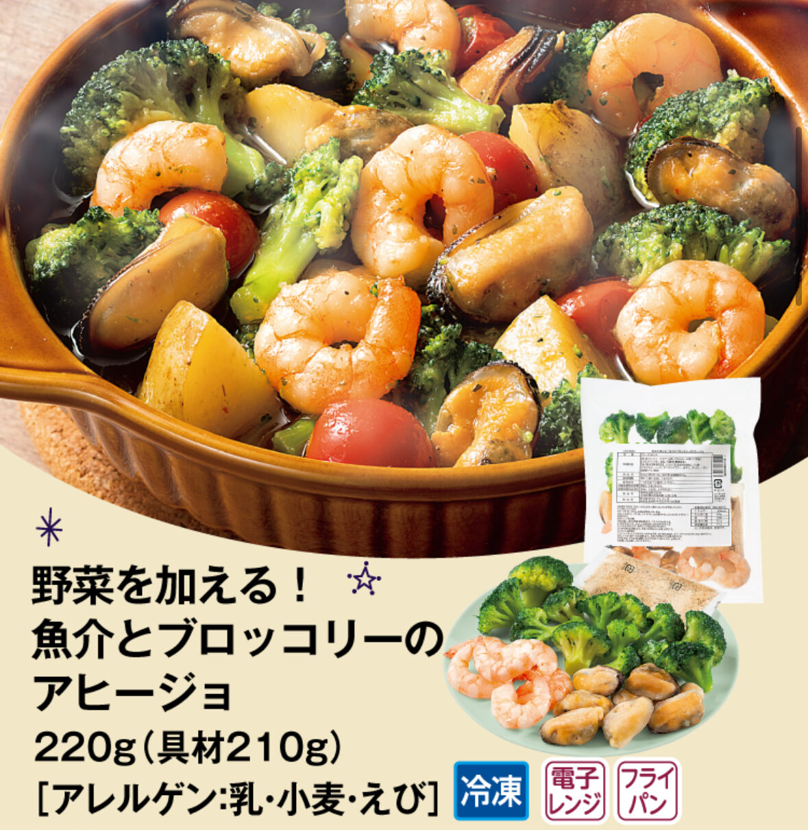 魚介とブロッコリーのアヒージョは、レンジやフライパンで簡単に作れる冷凍ミールキットです。添付の粉末調味料を使うので味付けに迷うこともなく、お好みで野菜を追加すればアレンジも自在。